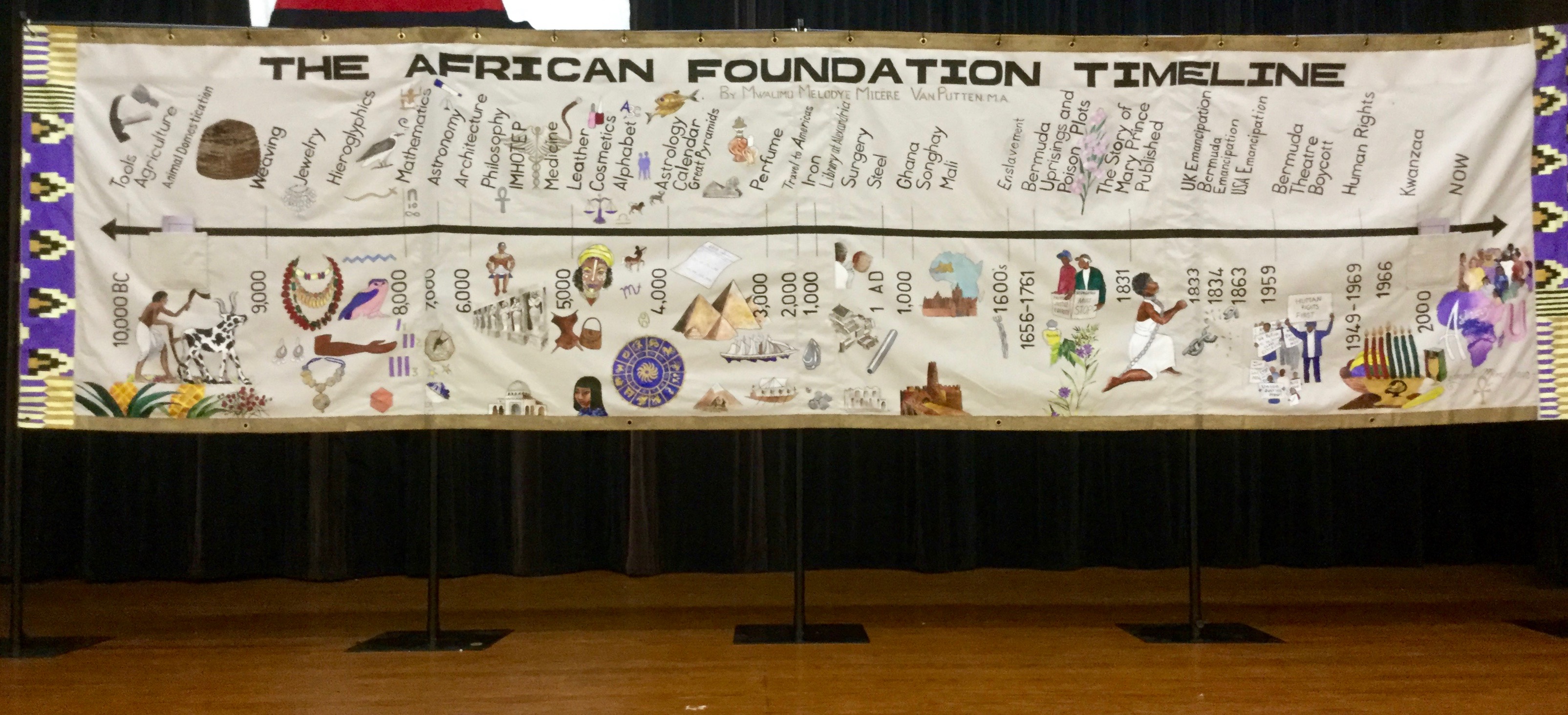 In 2018, via the Continuing SBA course, the Ashay University Community came together to ensivion, create, produce and finance the MOBILE AFRICAN FOUNDATION TIMELINE (MAFT), a teaching tool developed by Mwalimu Melodye Micere Van Putten to demonstrate the contributions of African people that created the foundation of world civilization. During the six-month project, materials were acquired, additional information was researched and inserted and funding was raised within the Ashay U community family. The visually compelling timeline is sixteen feet long and four feet high and beautifully hand-painted by artist and educator Mrs. Angela Ming-Bean.